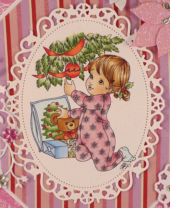 Suzie, your card is just adorable! Love the pretty pinks, the papers, your beautifully colored image, and your embellies. And the glittered poinsettia is fantastic! :^)